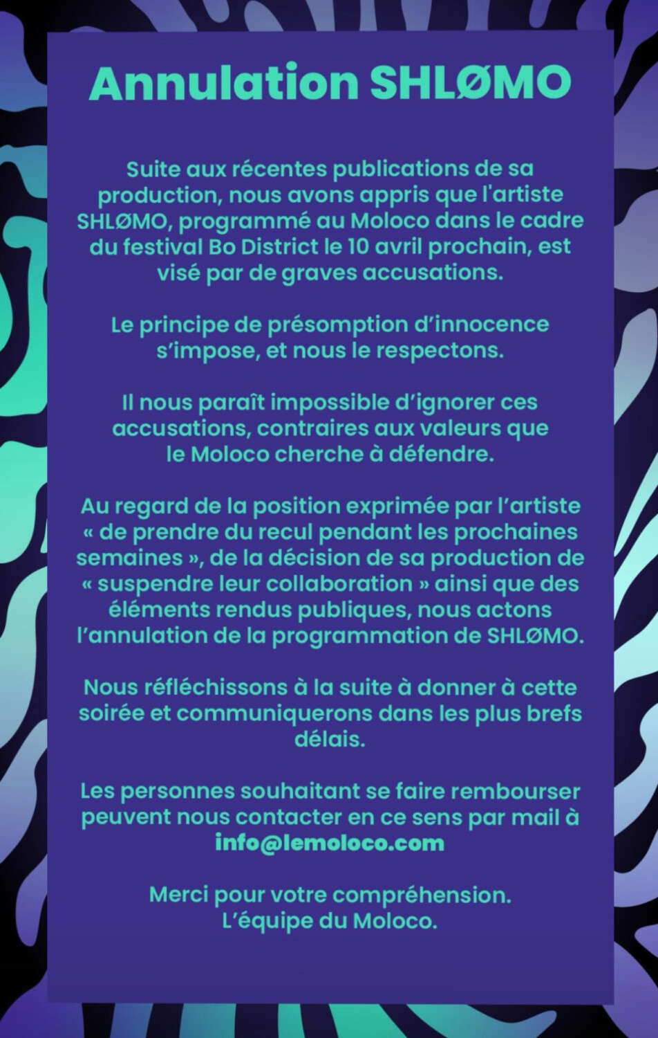 Suite à l’annulation de Shlømo (lire notre communiqué), si vous souhaitez vous faire rembourser, vous pouvez nous contacter en ce sens à l’adresse info@lemoloco.com